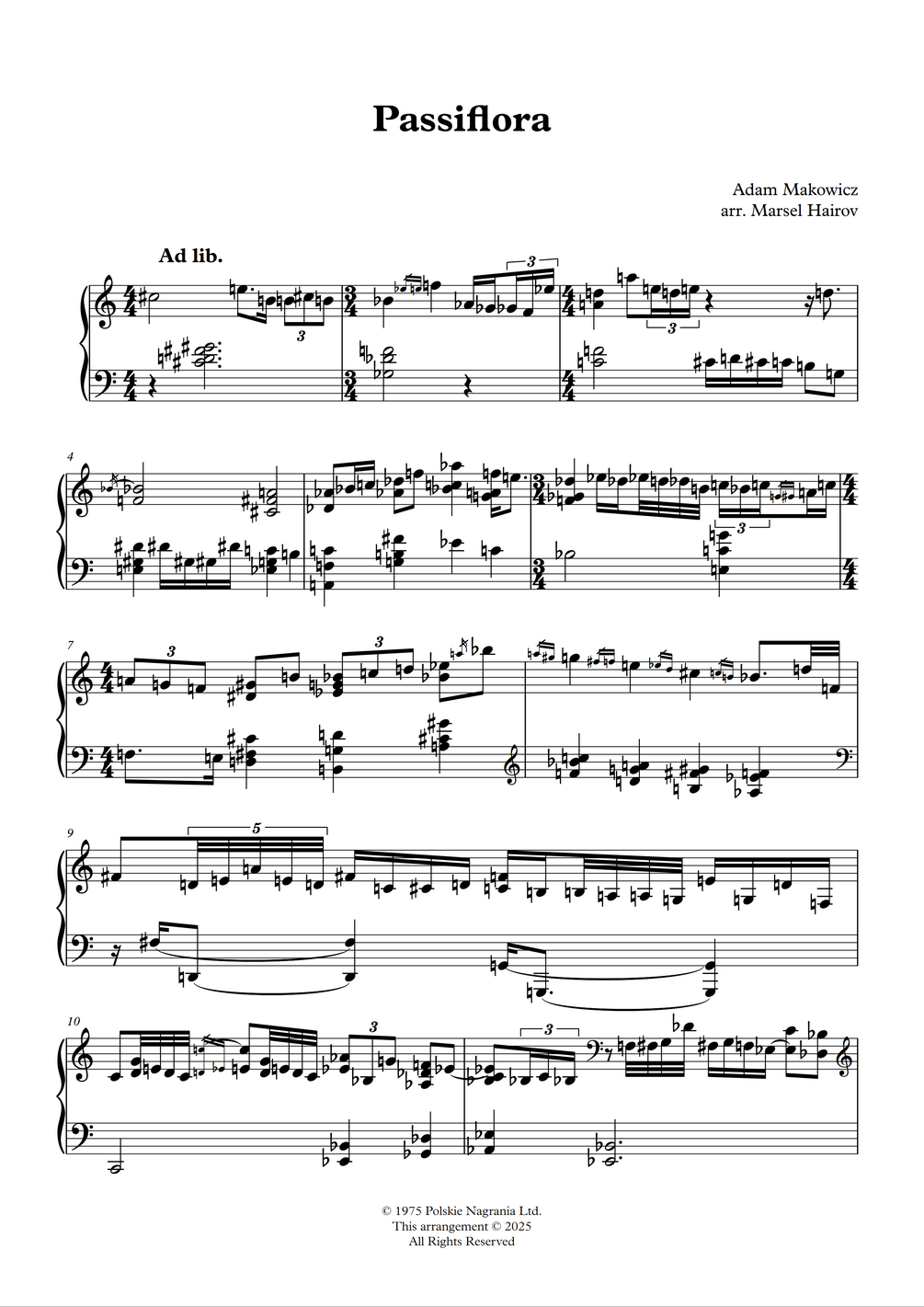 "Passiflora" is a composition by the renowned Polish-Canadian jazz pianist Adam Makowicz, written in his characteristic style of lyrical jazz with elements of classical music and impressionism.